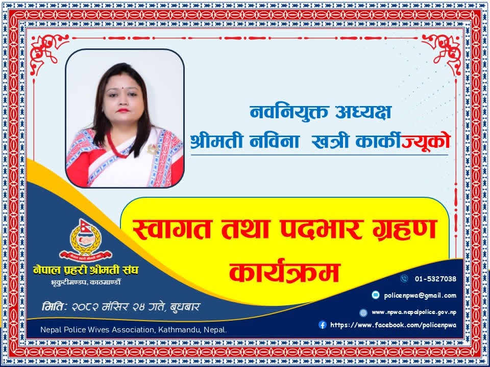 काठमाडौं । नेपाल प्रहरी श्रीमती संघ, भृकुटीमण्डप काठमाडौंमा नव-नियुक्त अध्यक्ष श्रीमती नविना खत्री कार्कीको सम्मानमा आयोजित स्वागत तथा पदभार ग्रहण कार्यक्रम भव्य रूपमा सम्पन्न भएको छ।