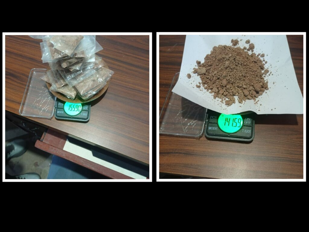 बरामद हेरोइन प्लाष्टिक र कागजमा बेरेर तौलयन्त्रमा नापिएको अवस्थामा फेला परेको थियो।