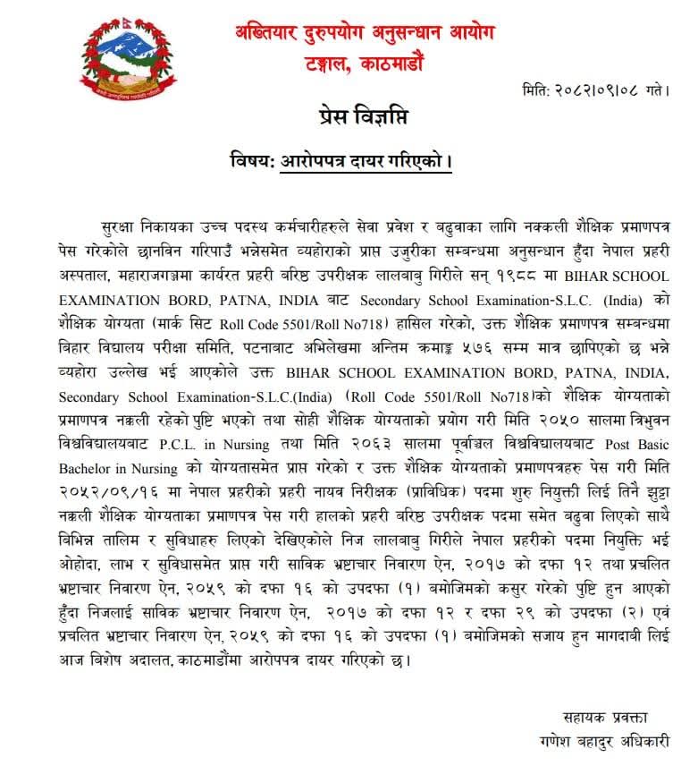 मंगलबार अख्तियार दुरुपयोग अनुसन्धान आयोगले नक्कली प्रमाणपत्र सम्बन्धी आरोपमा नेपाल प्रहरी अस्पताल, महाराजगञ्जमा कार्यरत एसएसपी लालबाबु गिरीविरुद्ध विशेष अदालत काठमाडौंमा मुद्दा दायर गरेको हो ।