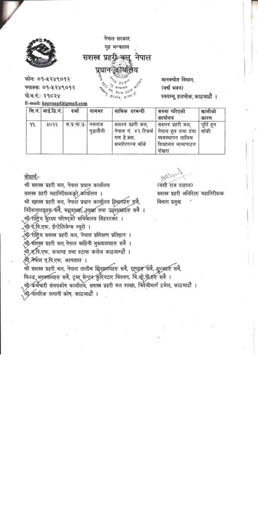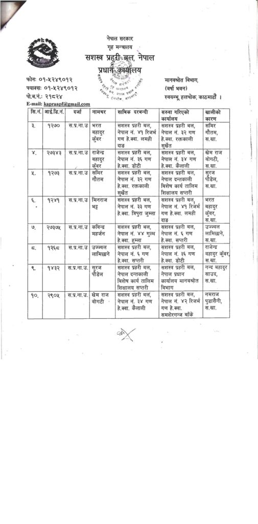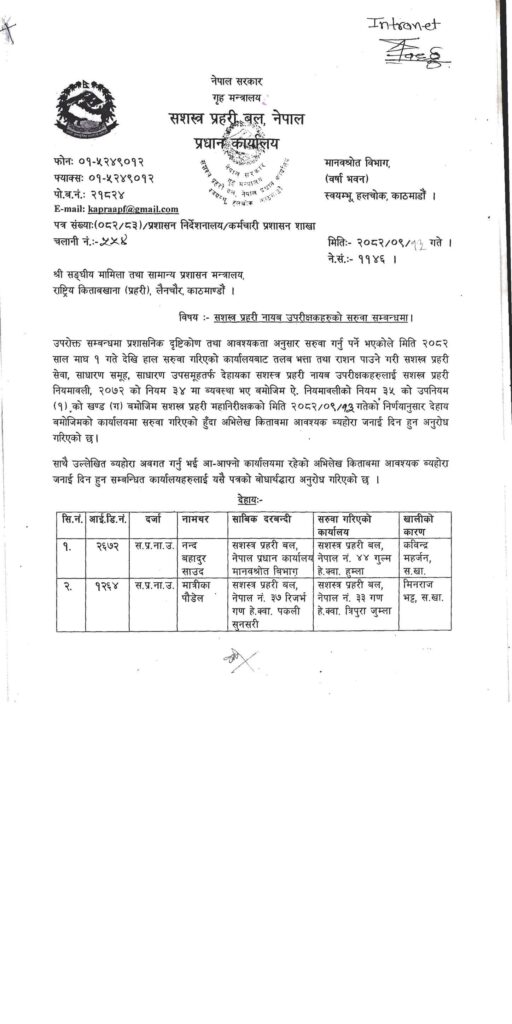 जसअनुसार हाल सशस्त्रको मुख्यालय हलचोकको मानस्रोत विभागमा कार्यरत नन्दबहादुर साउदको हुम्ला सरुवा भएको छ ।