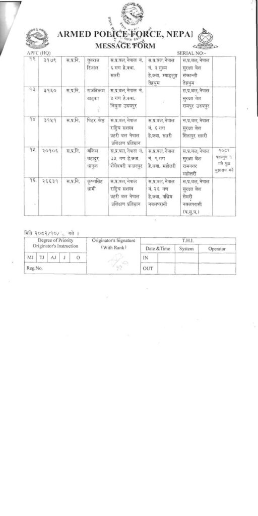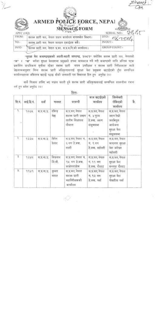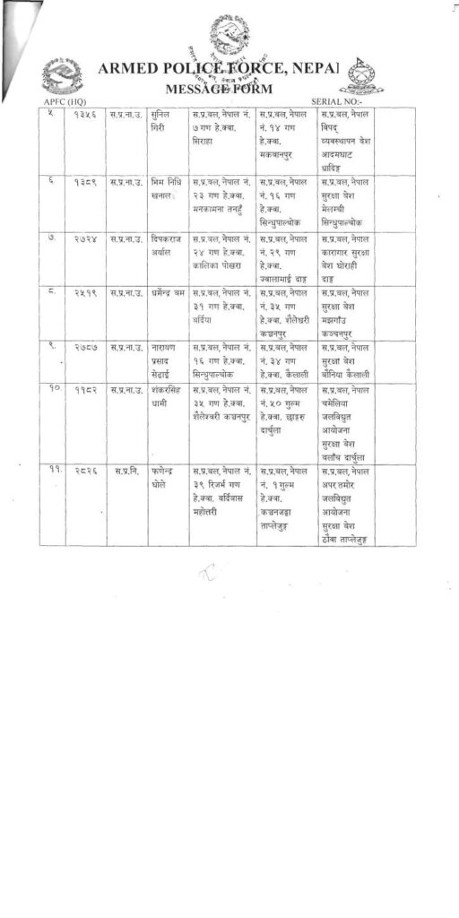 काठमाडौं । सशस्त्र प्रहरी बलले सशस्त्र प्रहरी नायब उपरीक्षक (डिएसपी) र सशस्त्र प्रहरी निरीक्षक (इन्स्पेक्टर) हरुको सरुवा गरेको छ ।
