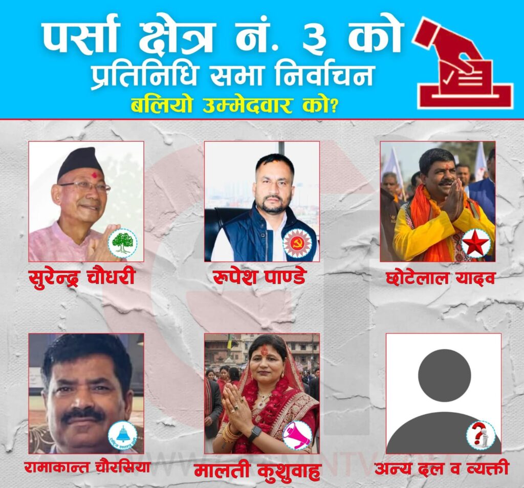 आसन्न फागुन २१ गते हुने प्रतिनिधि सभाको निर्वाचनमा पर्सा क्षेत्र नम्बर ३ मा नेपाली काग्रेसका उम्मेदवार चौधरी पहिलो स्थानमा रहेका छन् भने नेपाली कम्युनिस्ट पार्टीका उम्मेदवार छोटेलाल यादव दोस्रो स्थानमा र तेस्रो स्थानमा रावस्पाका उम्मेदवार रामाकन्त चौरसिया र चौथोमा नेकपा एमालेका उम्मेदवार रुपेस पाण्डे रहेका छन्।नेपाल काग्रेसका उम्मेदवार चौधरी २०७४ सालको निर्वाचन हरिनारायण रौनियार संग पराजित भएका थिए।त्यसैगरी २०७९ सालको निर्वाचनमा एमालेका उम्मेदवार राज कुमार गुप्ता संग झिनो मतले चौधरी पराजित भएका थिए।पर्सा जिल्ला क्षेत्र नम्बर ३ मा पुर्व मन्त्री, सासंद गरि एक दर्जन भन्दा बढी उम्मेदवारी परेको छ।नेपाली काग्रेसबाट सुरेन्द्र चौधरी,नेकपा एमालेका रुपेश पाण्डे ,जसपा नेपालबाट नागेन्द्र यादवनेपाली कम्युनिस्ट पार्टी( पुर्व माओवादी )का छोटेलाल यादव,राष्ट्रिय स्वतन्त्रबाट रामाकान्त चौरसिया प्रतिस्पर्धीका रूपमा देखिएका छन्।