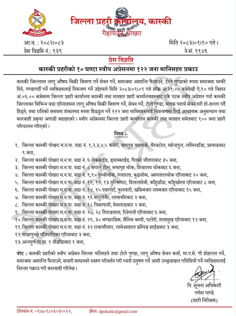 पोखरा । जिल्ला प्रहरी कार्यालय कास्की ले १० घण्टे ‘स्वीप अप्रेसन’ सञ्चालन गर्दै १२२ जनालाई नियन्त्रणमा लिएको छ।