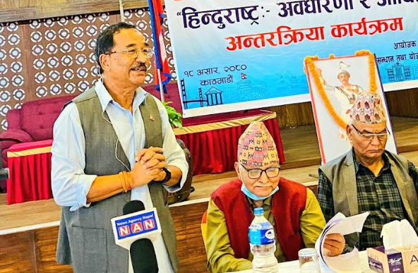 आज पार्टीको अनुसन्धान तथा योजना विभागद्वारा काठमाडौंमा आयोजित ‘हिन्दुराष्ट्र’ :- ‘अवधारणा र औचित्य’ बिषयक अन्तक्रियामा कार्यपत्र प्रस्तुत गर्दै थापाले हिन्दुराष्ट्रको अवधारणालाई सहि अर्थमा बुझ्नु र बुझाउन जरुरी भएको चर्चा गरे ।