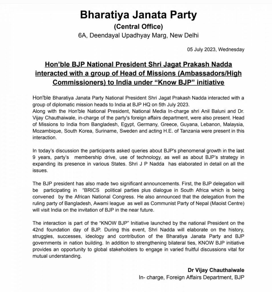 विभिन्न देशका राजनीतिक दलका नेताहरूलाई भाजपाले भारतमा बोलाएर पार्टीको गतिविधि बारे जानकारी गराउँदै आएकमो छ ।