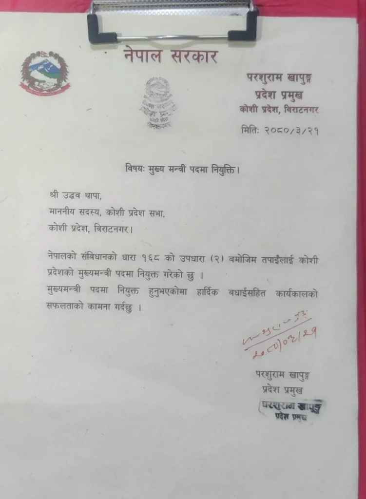प्रदेश प्रमुख खापुङले थापालाई नेपालको संविधानको धारा १६८ को उपधारा (२) बमोजिम मुख्यमन्त्रीमा नियुक्त गरेका हुन् ।