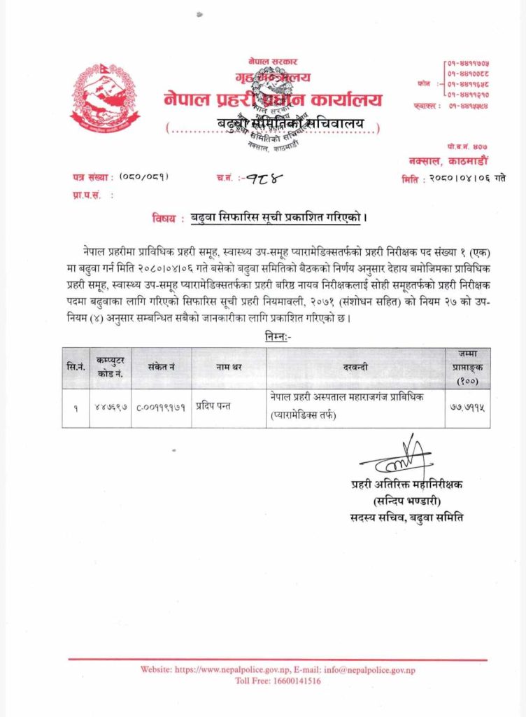 काठमाडौं । नेपाल प्रहरीको प्रहरी निरीक्षक (इन्स्पेक्टर) पदमा एक जना बढुवा भएका छन् । बढुवा हुनेमा प्रदिप पन्त रहेका छन् ।