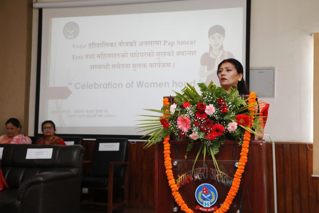 सो अवसरमा नेपाल प्रहरी श्रीमती संघकी अध्यक्ष श्रीमती लक्ष्मी कुँवरले सम्पूर्णमा तीजको शुभकामना व्यक्त गर्दै आपसी सद्भाव कायम राख्न सहयोग पुगोस् भन्ने हेतुले कार्यक्रमको आयोजना गरिएको बताइन् । यसले आफ्नो धर्म, संस्कृतिको जगेर्ना गर्न र सद्भाव वृद्धि गर्न योगदान पुर्यामउने विश्चास उनले व्यक्त गरिन् ।