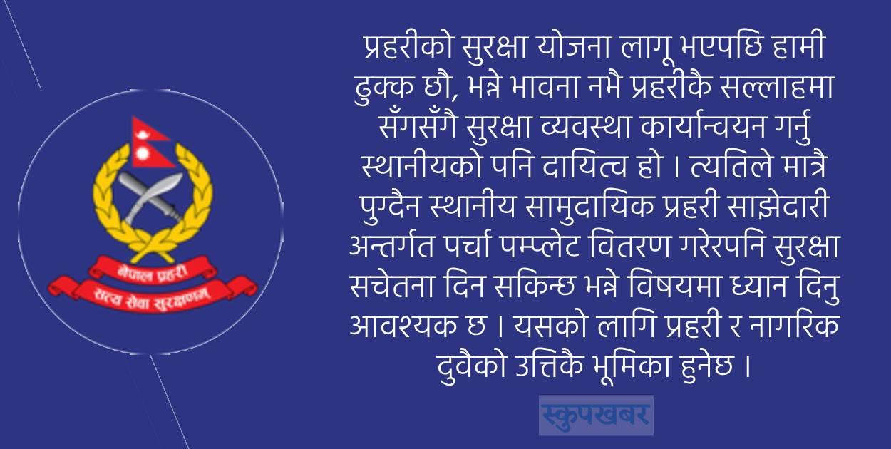 त्यतिले मात्रै पुग्दैन स्थानीय सामुदायिक प्रहरी साझेदारी अन्तर्गत पर्चा पम्प्लेट वितरण गरेरपनि सुरक्षा सचेतना दिन सकिन्छ भन्ने विषयमा ध्यान दिनु आवश्यक छ । यसको लागि प्रहरी र नागरिक दुवैको उत्तिकै भूमिका हुनेछ ।