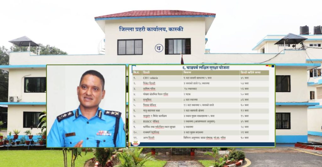 काठमाडौं । जिल्ला प्रहरी कार्यालय, कास्कीले ‘चाडपर्व लक्षित सुरक्षा योजना’ तयार पारेको छ । चाडपर्वहरू नजिकिँदै जाँदा कास्की प्रहरीले ‘चाडपर्व लक्षित सुरक्षा योजना’ सार्वजनिक गरेको हो ।