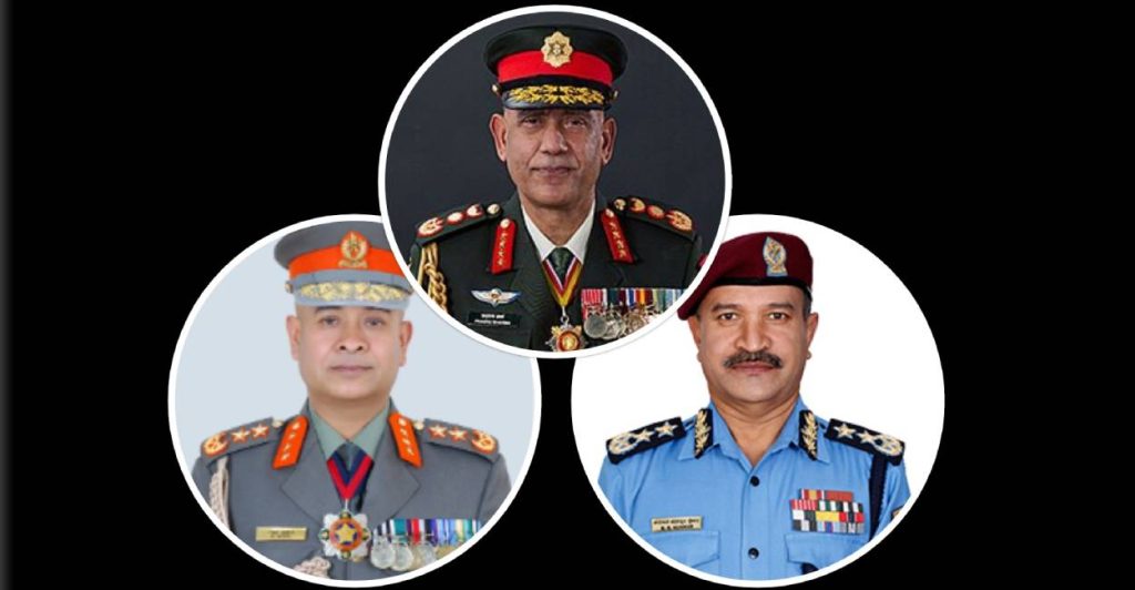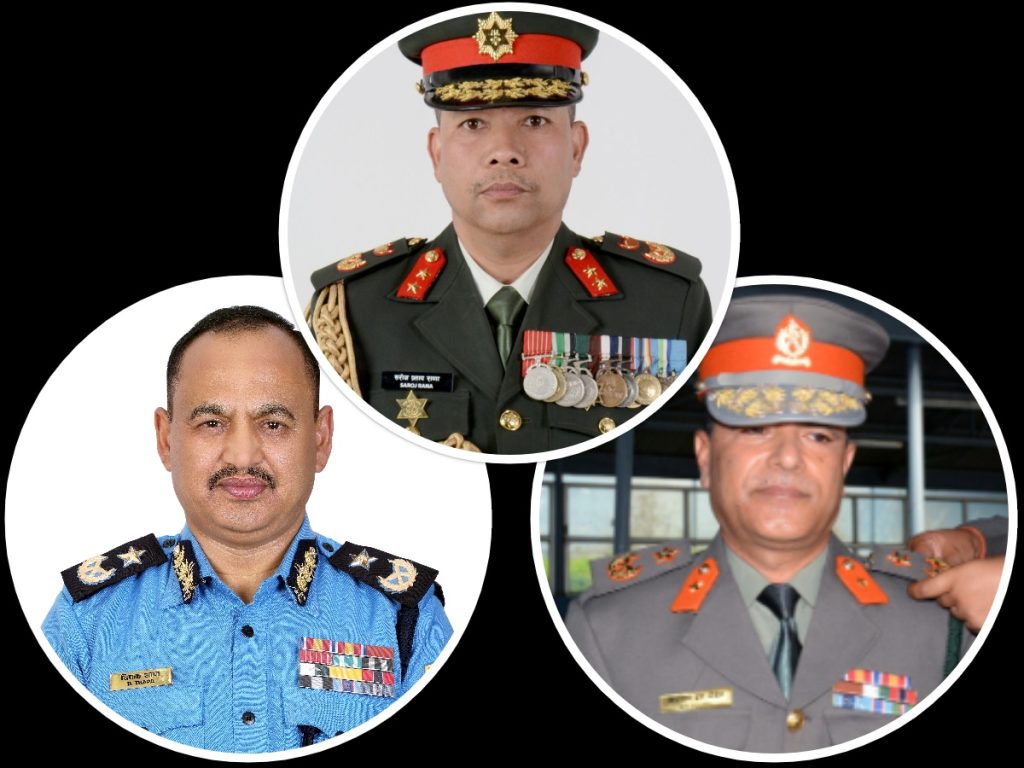 काठमाडौं । यतिबेला तीनवटै सुरक्षा निकायका प्रमुख देशबाहिर बाहिर छन् । नेपाली सेना, नेपाल प्रहरी र सशस्त्र प्रहरीका प्रमुख देशबाहिर रहेका हुन् ।