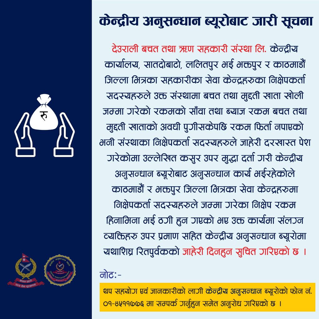 सोमबार ब्यूरोले सूचना जारी गर्दै भनेको छ, ‘काठमाडौं र भक्तपुर जिल्लाभित्रका सेवा केन्द्रहरूमा निक्षेपकर्ताले सदस्यहरूले जम्म गरेका निक्षेप रकम हिनामिना भई ठगी हुन गएको भए उक्त कार्यालयमा संलग्न व्यक्तिहरूउपर प्रमाणसहित केन्द्रीय अनुसन्धान ब्यूरोमा यथाशीघ्र रितपूर्वक जाहेरी दिनहुन सूचित गरिन्छ ।’