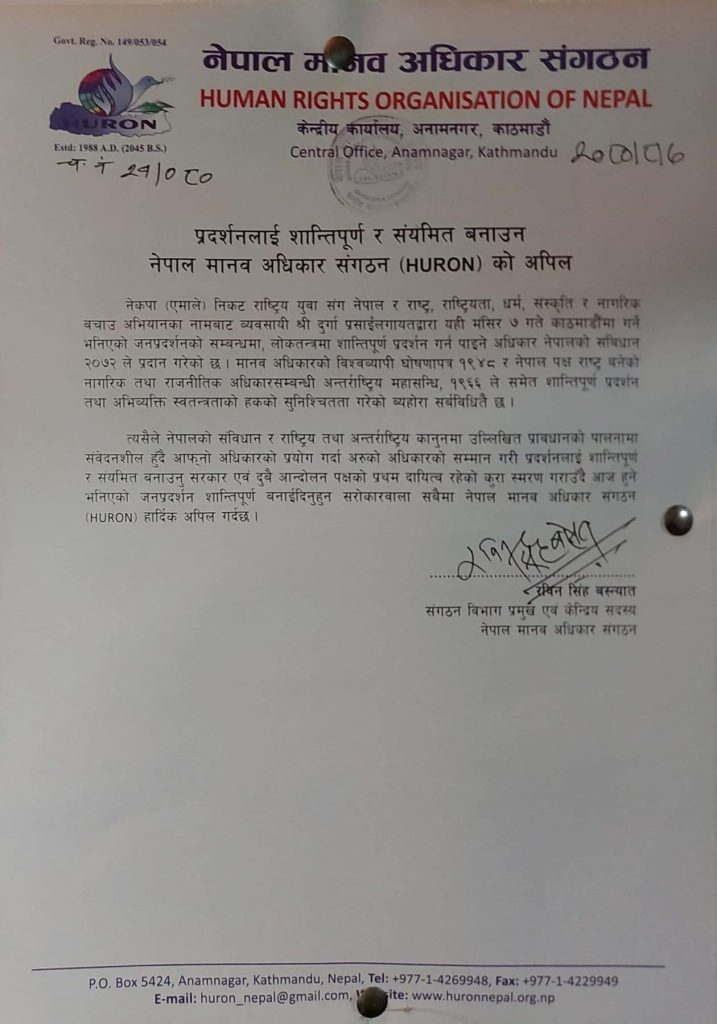 संगठनले नेपालको संविधान र राष्ट्रिय तथा अन्तर्राष्ट्रिय कानुनमा उल्लिखित प्रावधानको पालनामा संवेदनशील हुँदै आफ्नो अधिकारको प्रयोग गर्दा अरुको अधिकारको सम्मान गरी प्रदर्शनलाई शान्तिपूर्ण र संयमित बनाउन सबै पक्षलाई आग्रह गरेको हो ।