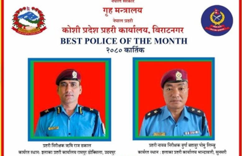 कोशी प्रदेश प्रहरी कार्यालयले उयदपुरको इप्रका रामपुर, ठोक्सिलामा कार्यरत इन्सपेक्टर ऋषिराम ढकाल र इलाका प्रहरी कार्यालय भान्टावारी, सुनसरीमा कार्यरत सई दुर्गा बहादुर लिम्बुलाई कात्तिक महिनाको ‘पुलिस अफ दी मन्थ’ पुरस्कार दिएको हो ।