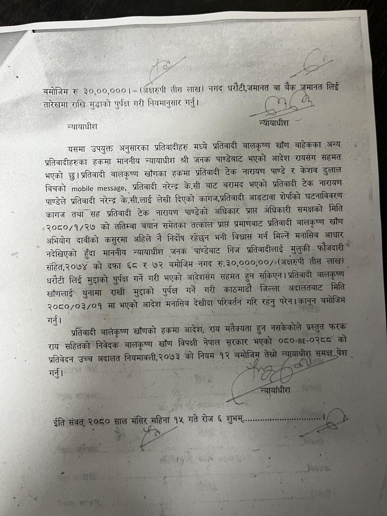 पूर्वगृहमन्त्री खाणलाई ३० लाख धरौटीमा छाड्ने न्यायधीश पाण्डेको आदेशमा अर्का न्यायाधीश खरेलको राय बाझिएपछि अब अर्को इजलासमा यसको सुनुवाइ हुने भएको छ । अर्को सुनुवाई नभएपछि खाँण थुनामै बस्नुपर्ने हुन्छ ।